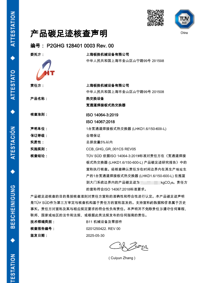 SH‑PHE'nin ısı değişim ekipmanları, yakın zamanda ürün yaşam döngüsü karbon ayak izi değerlendirmesini başarıyla tamamlayarak bağımsız ve yetkili bir üçüncü taraf kuruluştan sertifika almaya hak kazandı. 2024 kurumsal sera gazı doğrulama beyanımızı temel alan bu değerlendirme, daha çevre dostu ve düşük karbonlu operasyonlara geçişimizde önemli bir kilometre taşı niteliğinde olup, yeşil üretim ve yönetim uygulamalarını derinleştirmek için sağlam bir temel oluşturmaktadır.